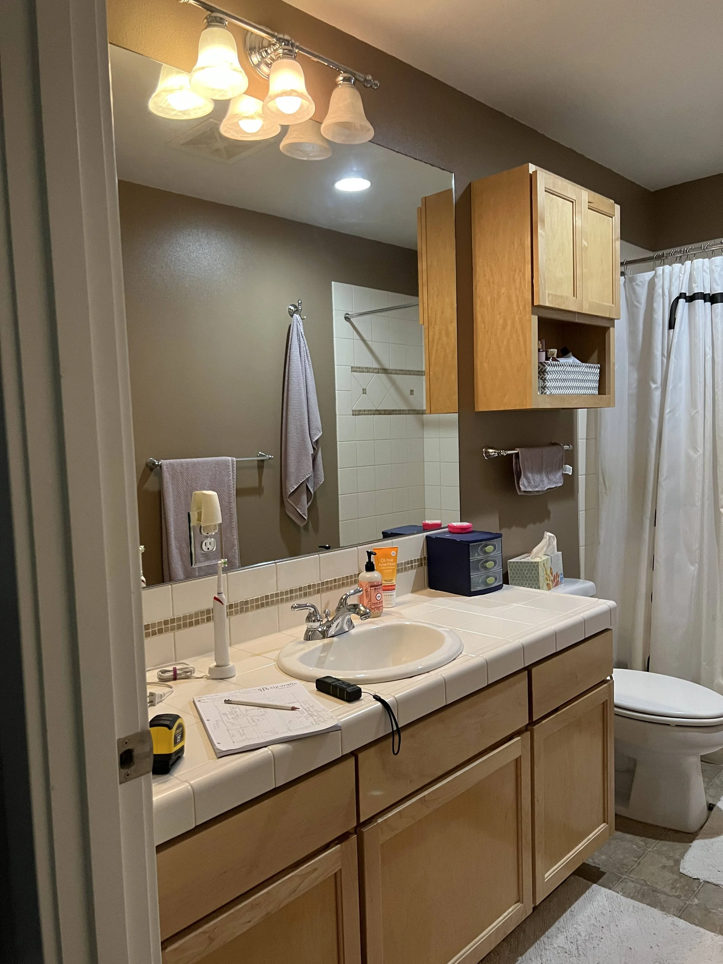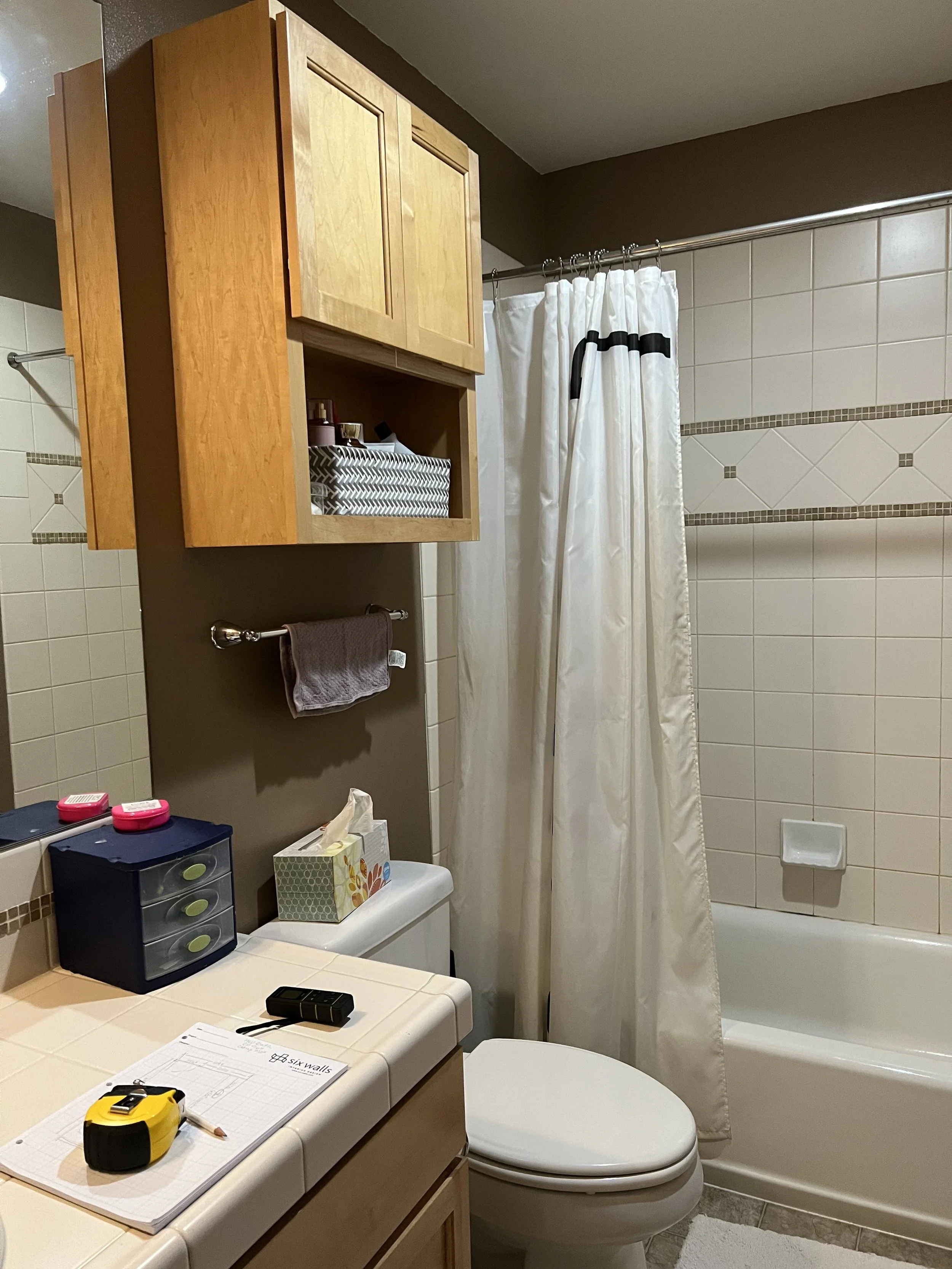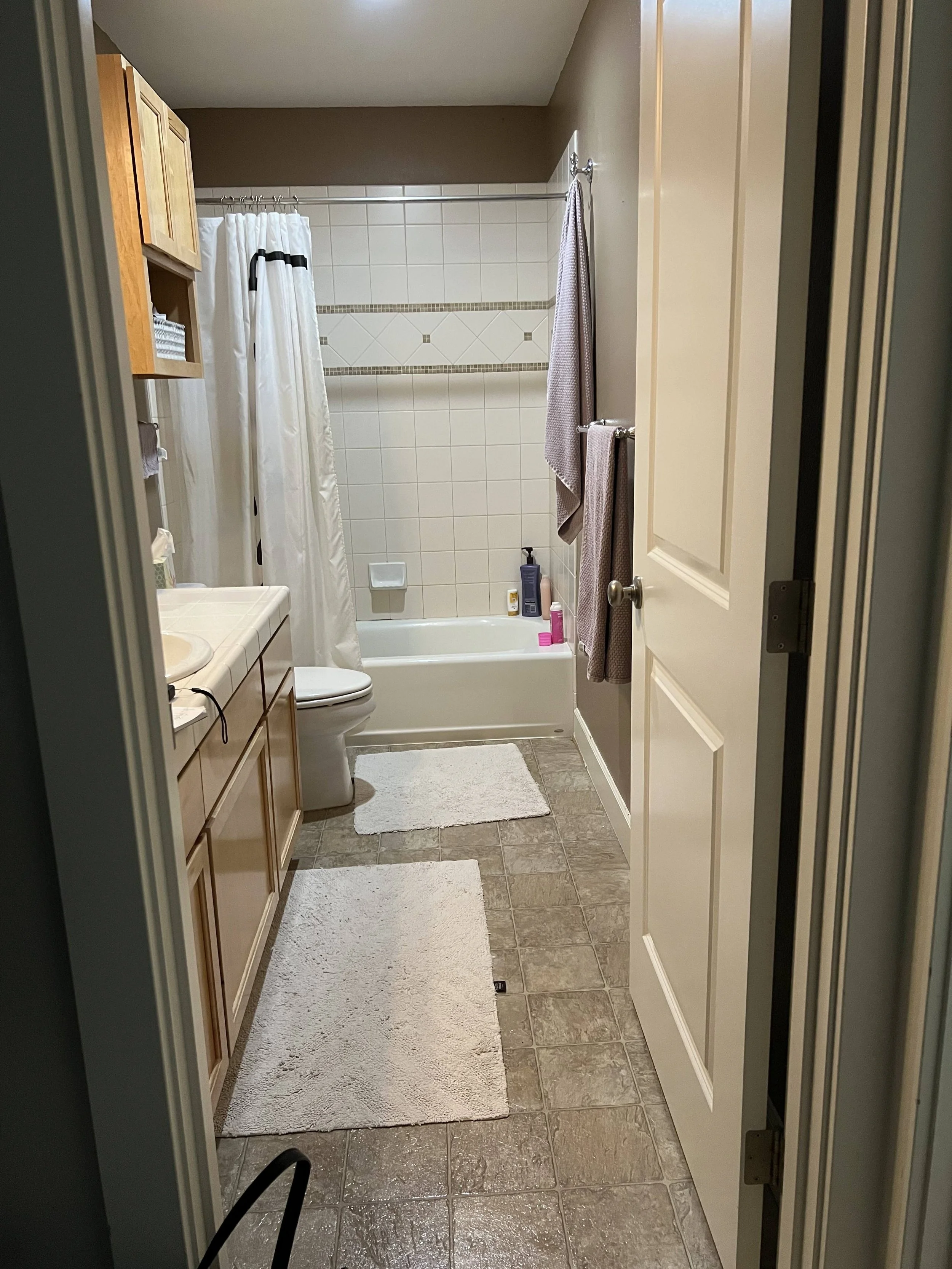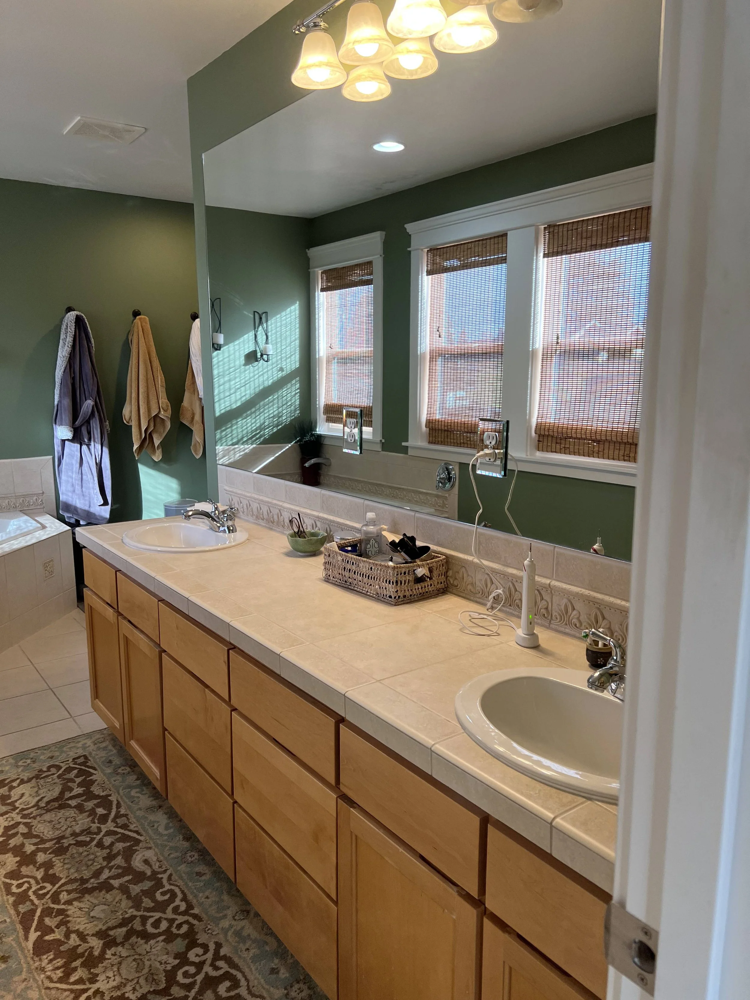 This bath was completely reconfigured to accommodate 3 young adults, while they’re home from college for visits. The window was added to create a light and bright tub/shower space. The bathtub was turned and a sleek shelf was added to hold shower and bath essentials. A linen closet in the bath and a twin cabinet in the hall(tucked on the other side of the door) increased the storage tremendously. Now there are two sinks on the vanity and the toilet is shyly hidden behind a pony wall for privacy. Custom tile and lighting top off this beautiful transformation!