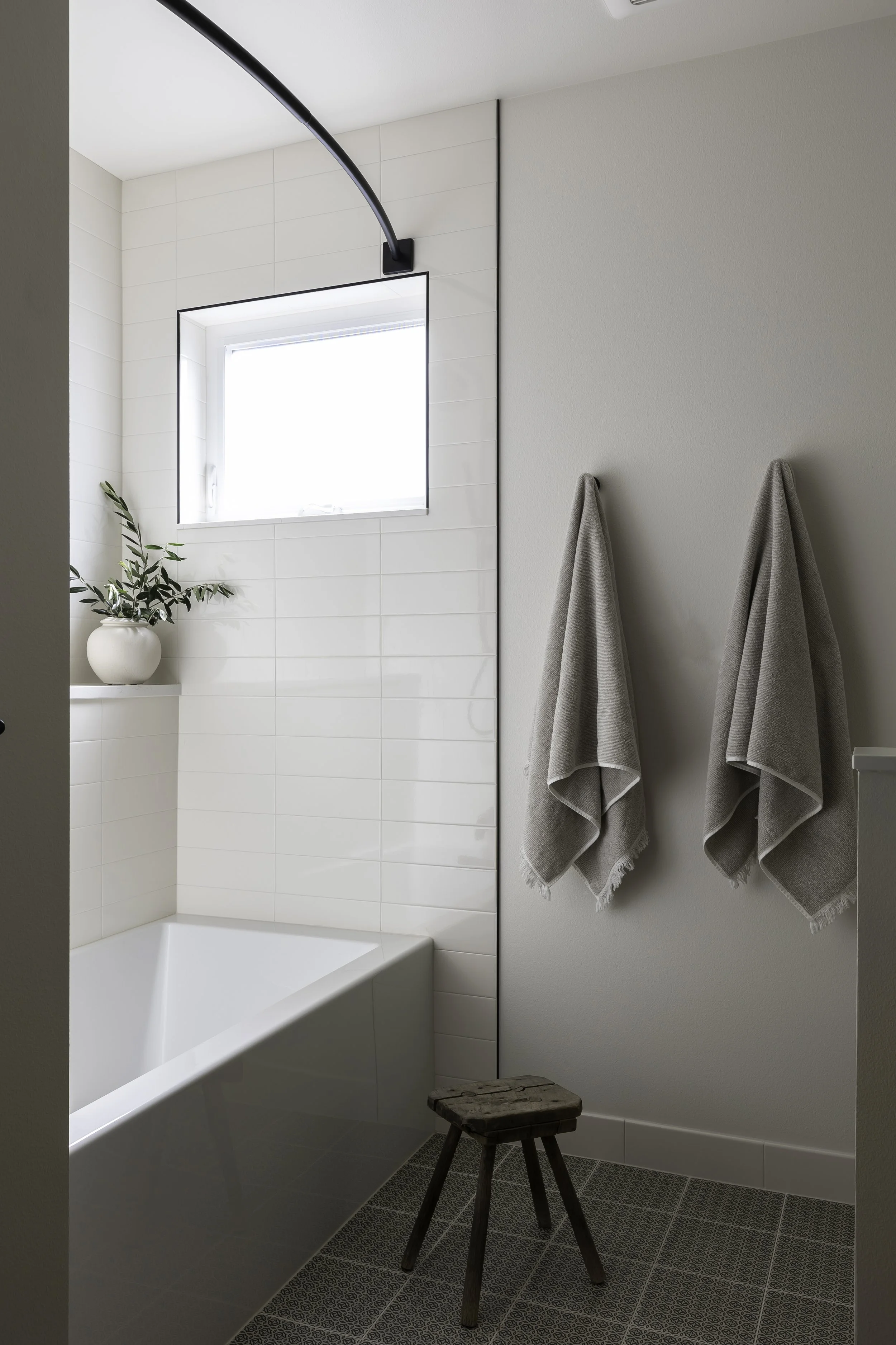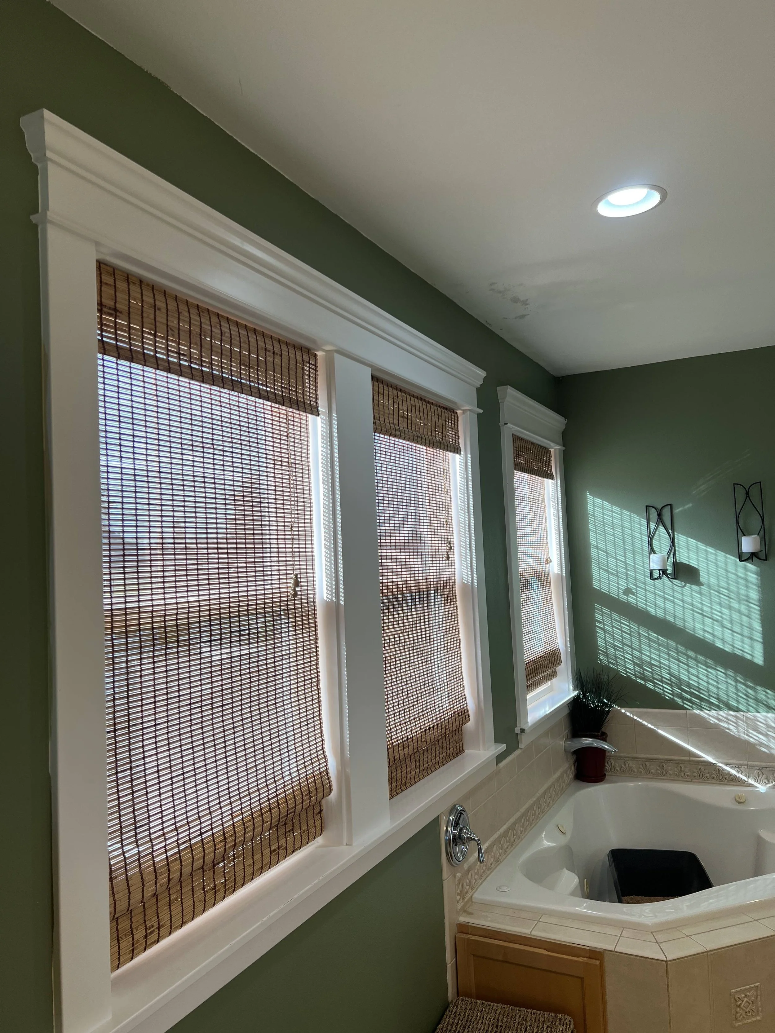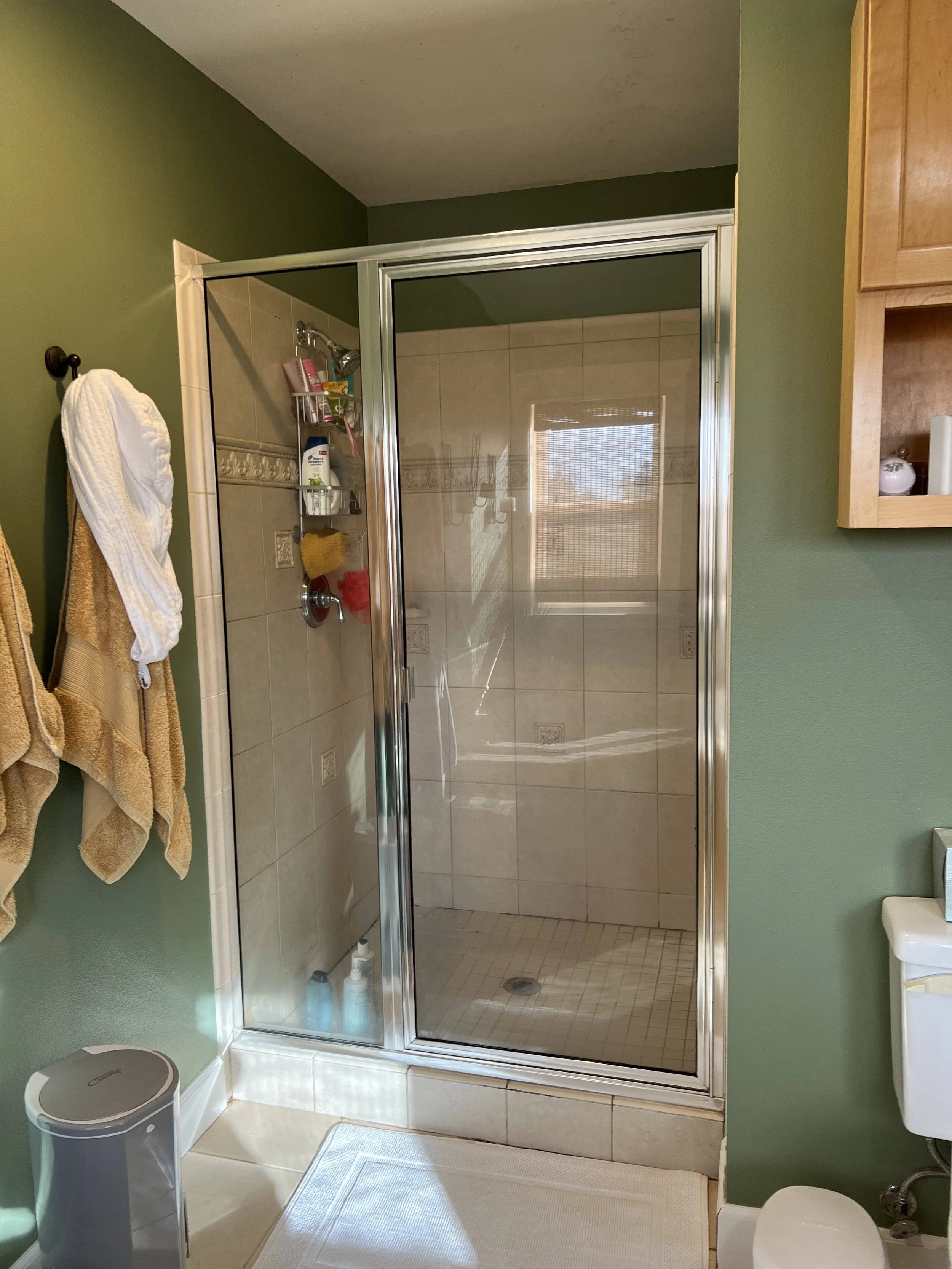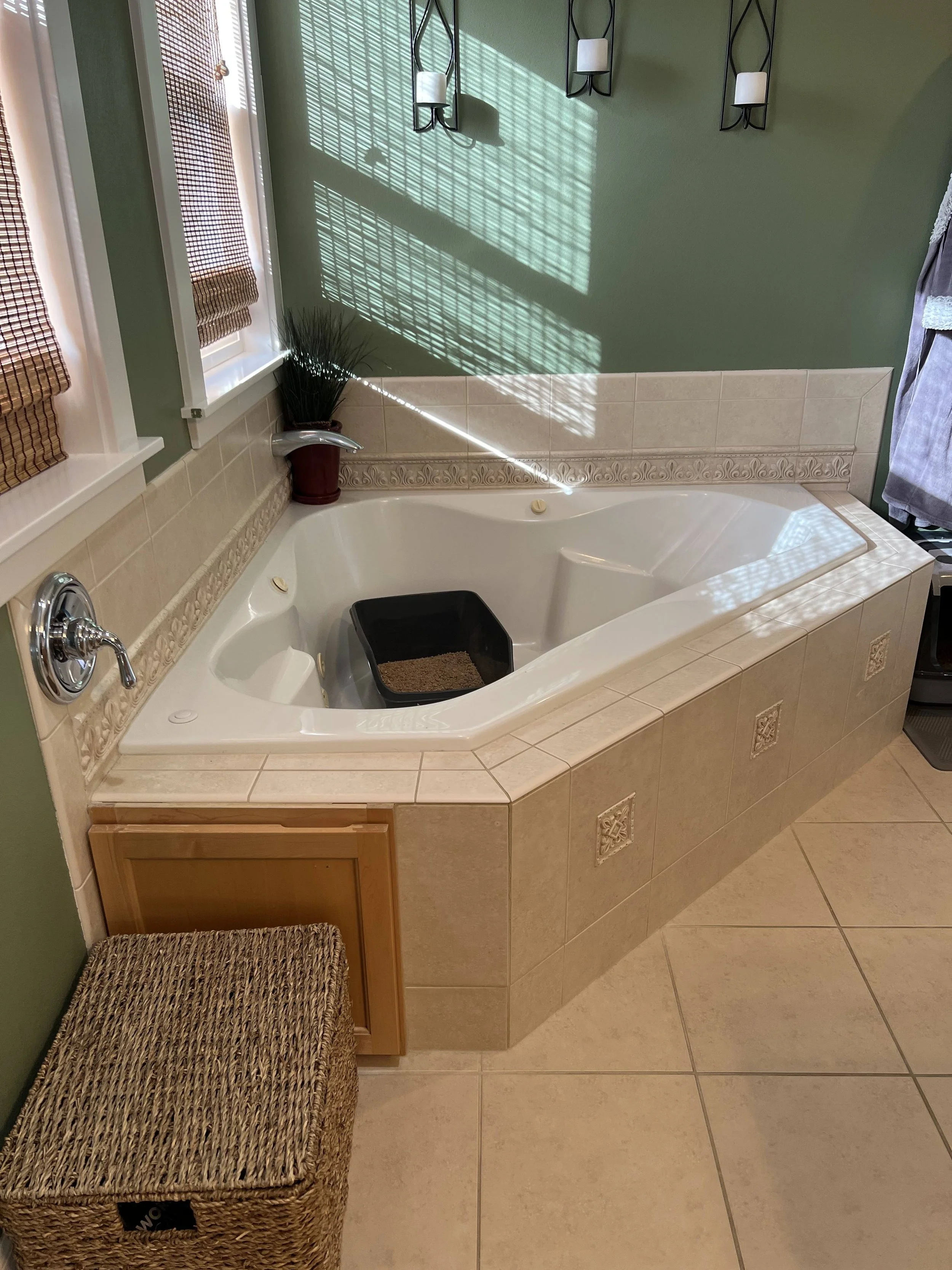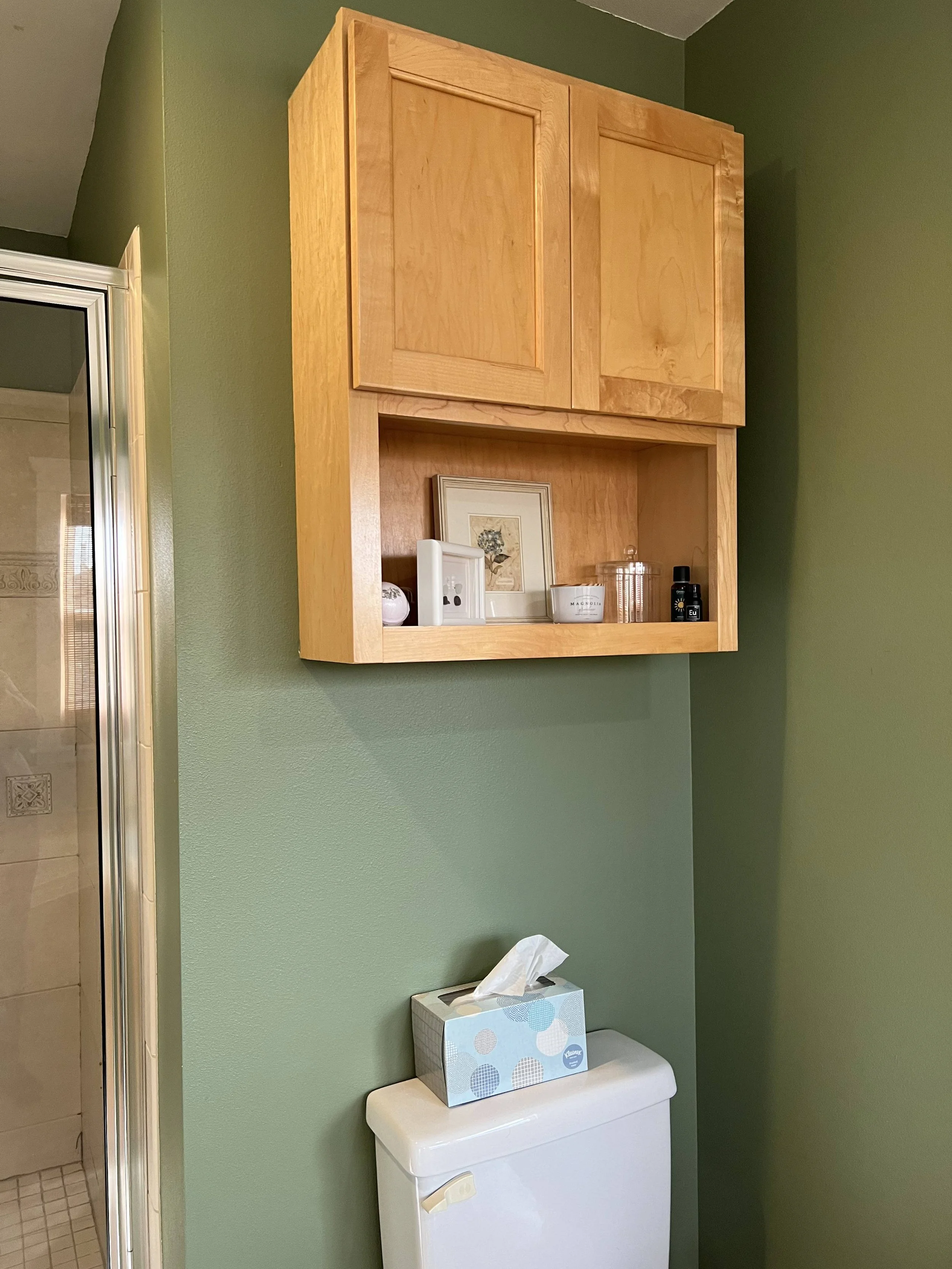 This bath was completely reconfigured to accommodate 3 young adults, while they’re home from college for visits. The window was added to create a light and bright tub/shower space. The bathtub was turned and a sleek shelf was added to hold shower and bath essentials. A linen closet in the bath and a twin cabinet in the hall(tucked on the other side of the door) increased the storage tremendously. Now there are two sinks on the vanity and the toilet is shyly hidden behind a pony wall for privacy. Custom tile and lighting top off this beautiful transformation!