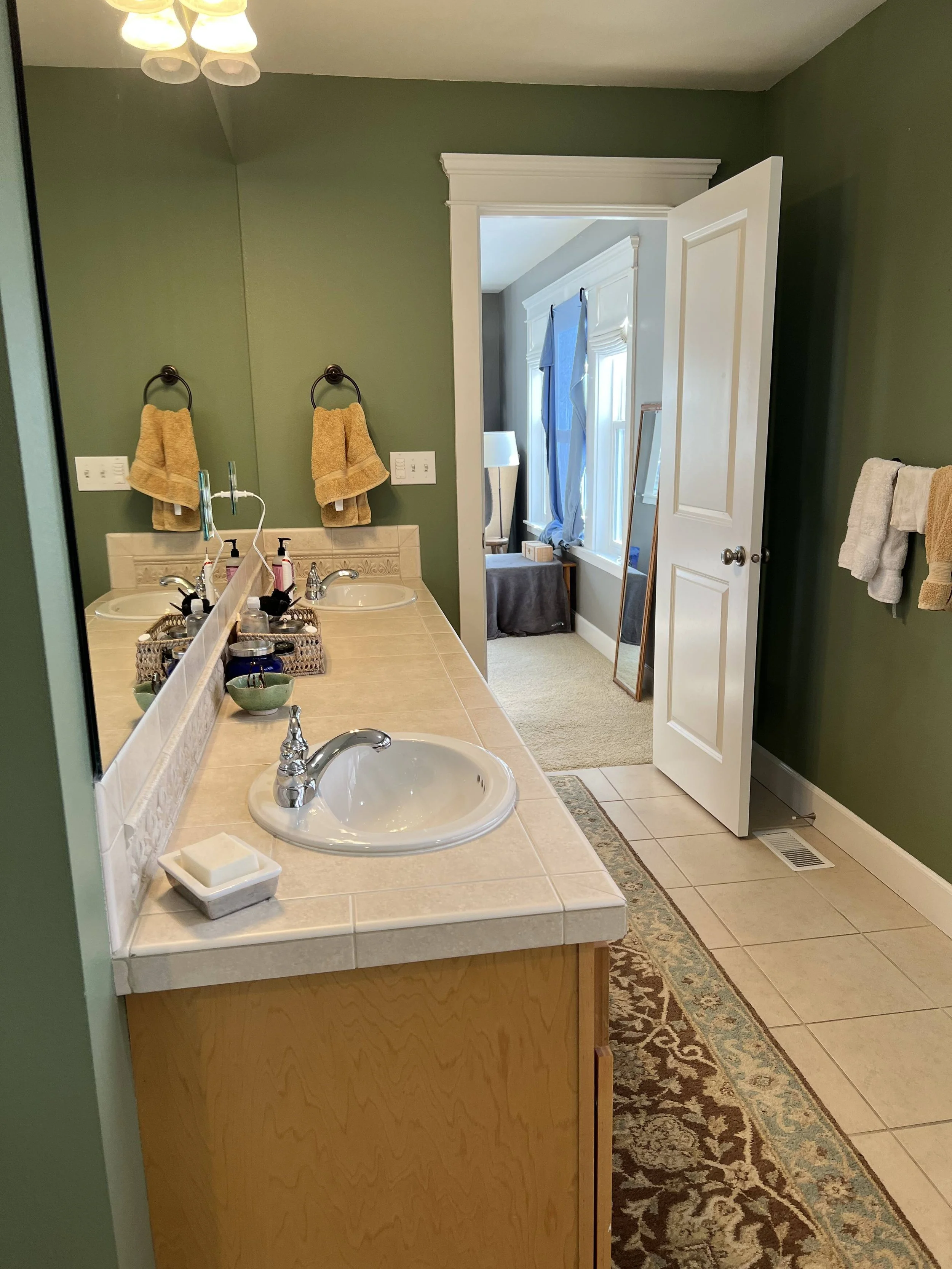 These clients were accustomed to a bustling house full of kids, and when their last child was leaving for college, they knew it was time to create a peaceful space to enjoy the quiet. We reconfigured the layout of both bathrooms to balance the space and increase the functionality in each. This primary bath was outfitted with a luxurious, freestanding tub and tub filler, surrounded by custom tile…a gorgeous place to enjoy the views! The shower boasts custom tile and luxe gold fixtures with a storage niche and petit bench. At the vanity, each sink has a medicine cabinet and there is ample mirrored space in between to prepare for the day ahead or wind down in the evening. Heated floors keep the bath warm underfoot and dry as well!